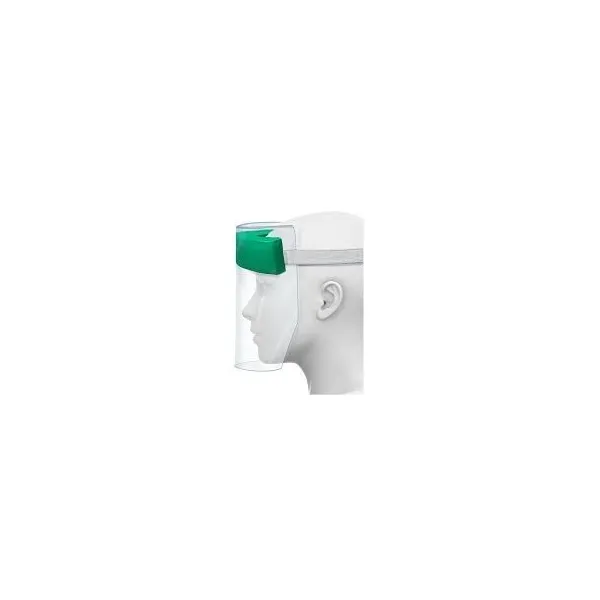 Bardatura morbida anallergica in appoggio alla fronte in LDPE espanso, banda elastica, sovrapponibile ai comuni occhiali da vista, ai facciali filtranti e alle mascherine chirurgiche, alta definizione ottica, schermo in acetato antiappannante.
